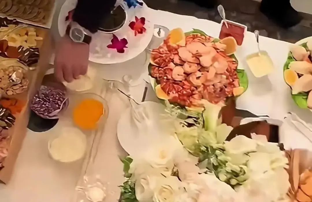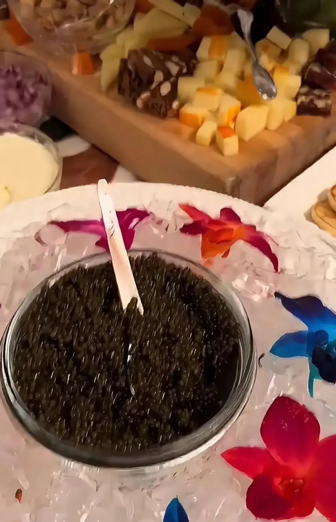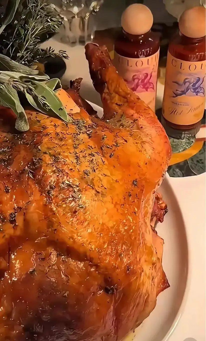 餐桌上,食材高等,摆盘高端,火鸡、蔬菜沙拉、曲奇饼干、南瓜派和多层蛋糕等好意思食一应俱全,色香味俱全,令东谈主野心勃勃。值得谨防的是,火鸡和鱼子酱是当晚的重头戏,而大布更是别出机杼地搭配我方推出的辣酱。