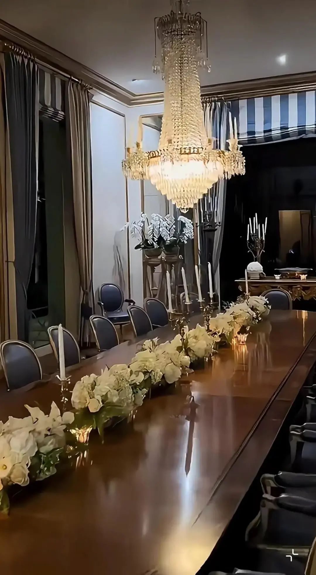 从大布共享在Instagram上的视频不错看到,总计晚餐的吩咐极为根究,繁密的水晶吊灯吊挂在长桌上方,桌上摆放着烛炬和鲜花,两旁是整王人的皮革椅子,荫庇有立场,烛台不菲,古董装璜更是彰显了眷属深厚的文化底蕴。